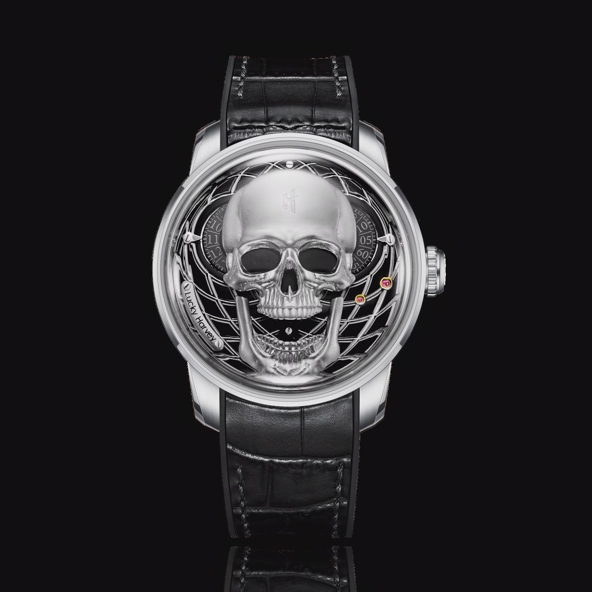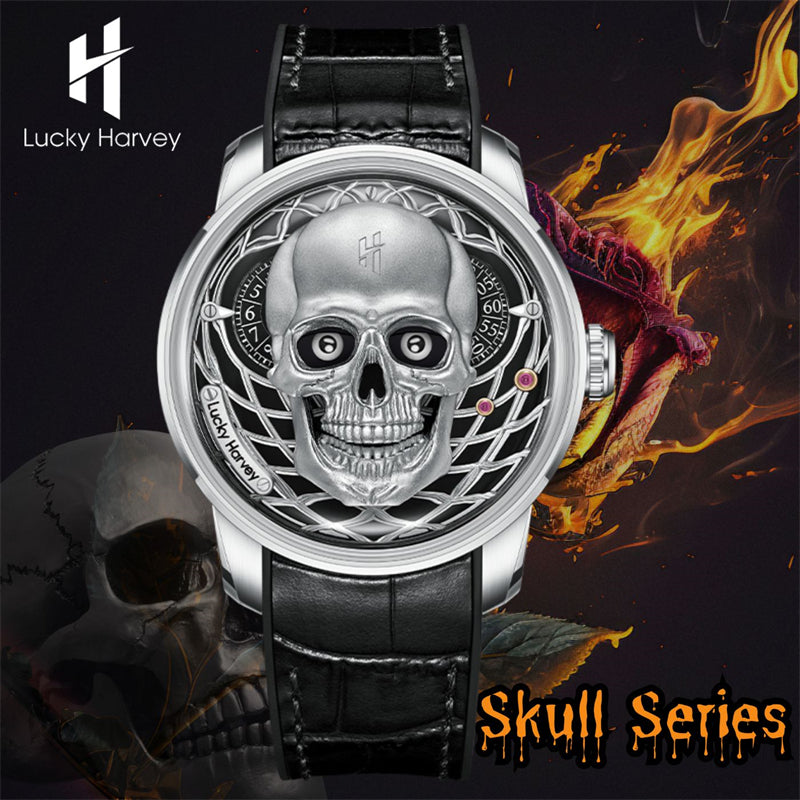 【Edición limitada de 111 piezas】Reloj con mecanismo automático de calavera plateada Lucky Harvey
